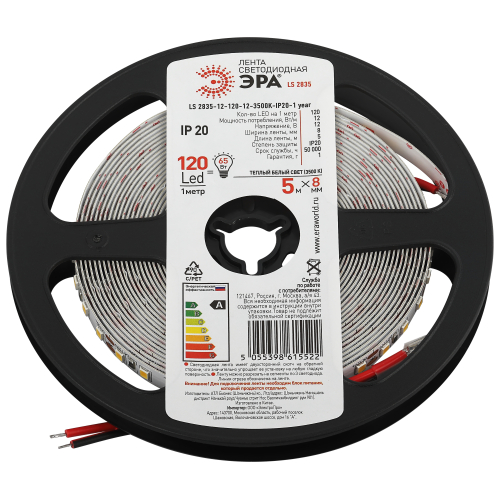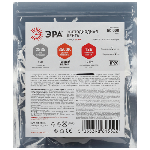 Светодиодная лента ЭРА LS2835 12-120-12-3500K-IP20-1 year-5m нейтральный белый свет со степенью защиты от пыли и влаги IP20 - современный способ создания внутреннего освещения, подсветки ниш, лестничного пространства, систем хранения, а также декоративного и художественного оформления любых объектов и форм в помещениях. Легко и быстро устанавливается на любой гладкой поверхности с помощью скотча, расположенного на оборотной стороне ленты. Используя алюминиевый профиль, можно создавать необычные и функциональные решения освещения в Вашем интерьере. Рабочее напряжение ленты составляет 12В, а мощность равна 12 Вт/м. Светодиодная лента обладает световым потоком 900 Лм/м, и цветом свечения - дневной белый (3500 К)