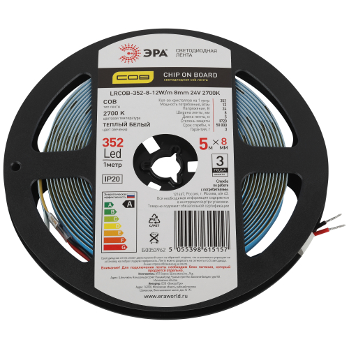 Лента светодиодная ЭРА LRCOB-352-8 12W/m 8mm 24V 2700K 3year белая 5 м со степенью защиты от пыли и влаги IP20 - современный способ создания внутреннего освещения, подсветки ниш, лестничного пространства, систем хранения, а также декоративного и художественного оформления любых объектов и форм в помещениях. Светодиодная СОВ лента сплошной засветки без видимых светодиодов. Легко и быстро устанавливается на любой гладкой поверхности с помощью скотча, расположенного на оборотной стороне ленты Используя алюминиевый профиль, можно создавать необычные и функциональные решения освещения в Вашем интерьере. Рабочее напряжение ленты составляет 24В, а мощность равна 12 Вт/м. Светодиодная лента обладает световым потоком 1020 Лм/м, и цветом свечения - теплый белый (2700 K)