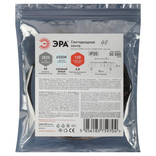ЭРА Лента светодиодная LS2835-4,8-60-12-6500К-IP20-2year-5m (140/4200) со степенью защиты от пыли и влаги IP20 - современный способ создания внутреннего освещения, подсветки ниш, лестничного пространства, систем хранения, а также декоративного и художественного оформления любых объектов и форм в помещениях. Легко и быстро устанавливается на любой гладкой поверхности с помощью скотча, расположенного на оборотной стороне ленты. Используя алюминиевый профиль, можно создавать необычные и функциональные решения освещения в Вашем интерьере. Рабочее напряжение ленты составляет 12В, а мощность равна 4,8 Вт/м. Светодиодная лента обладает световым потоком 500 Лм/м, и цветом свечения - холодный белый (6500 K)