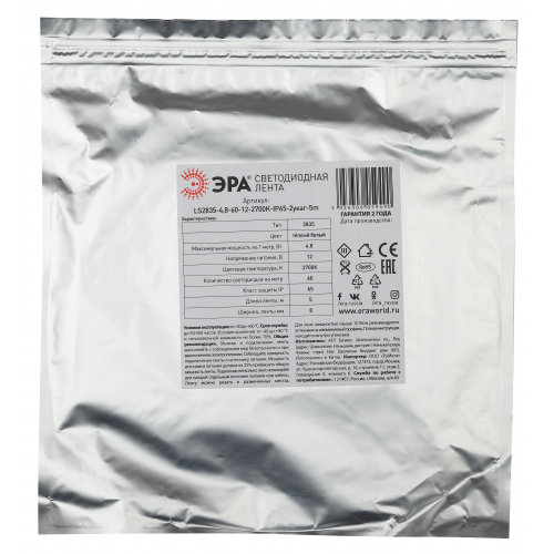ЭРА Лента светодиодная LS2835-4,8-60-12-6500К-IP65-2year-5m (80/2400) со степенью защиты от пыли и влаги IP65 - современный способ создания внутреннего освещения, подсветки ниш, лестничного пространства, систем хранения, а также декоративного и художественного оформления любых объектов и форм в помещениях с повышенным уровнем влажности и уличного освещения. Легко и быстро устанавливается на любой гладкой поверхности с помощью скотча, расположенного на оборотной стороне ленты. Используя алюминиевый профиль, можно создавать необычные и функциональные решения освещения в Вашем интерьере. Рабочее напряжение ленты составляет 12В, а мощность равна 4,8 Вт/м. Светодиодная лента обладает световым потоком 500 Лм/м, и цветом свечения - холодный белый (6500 K)