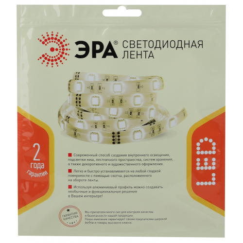 ЭРА Лента светодиодная LS2835-4,8-60-24-33-3000К-5m (60/960) со степенью защиты от пыли и влаги IP20 - современный способ создания внутреннего освещения, подсветки ниш, лестничного пространства, систем хранения, а также декоративного и художественного оформления любых объектов и форм в помещениях. Легко и быстро устанавливается на любой гладкой поверхности с помощью скотча, расположенного на оборотной стороне ленты Используя алюминиевый профиль, можно создавать необычные и функциональные решения освещения в Вашем интерьере. Рабочее напряжение ленты составляет 24В, а мощность равна 4,8 Вт/м. Светодиодная лента обладает световым потоком 450 Лм/м, и цветом свечения - теплый белый (3000 К)