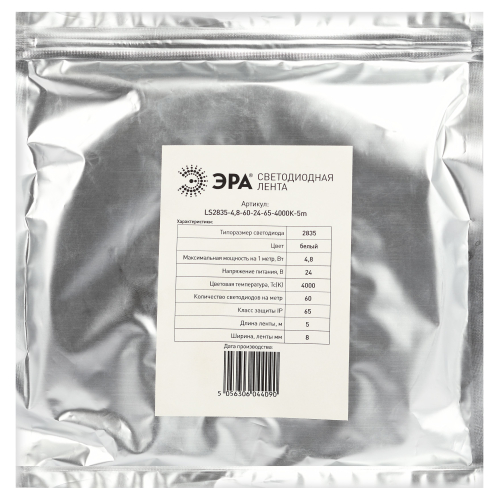 ЭРА Лента светодиодная LS2835-4,8-60-24-65-4000К-5m (50/800) со степенью защиты от пыли и влаги IP65 - современный способ создания внутреннего освещения, подсветки ниш, лестничного пространства, систем хранения, а также декоративного и художественного оформления любых объектов и форм в помещениях с повышенным уровнем влажности и уличного освещения. Легко и быстро устанавливается на любой гладкой поверхности с помощью скотча, расположенного на оборотной стороне ленты Используя алюминиевый профиль, можно создавать необычные и функциональные решения освещения в Вашем интерьере. Рабочее напряжение ленты составляет 24В, а мощность равна 4,8 Вт/м. Светодиодная лента обладает световым потоком 450 Лм/м, и цветом свечения - дневной белый (4000 К)