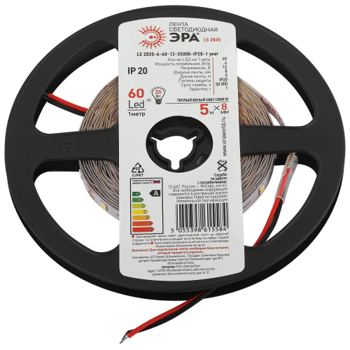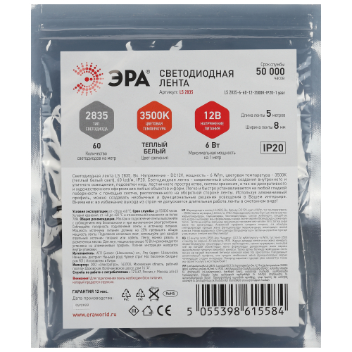 Светодиодная лента ЭРА LS2835 6-60-12-3500K-IP20-1 year-5m нейтральный белый свет со степенью защиты от пыли и влаги IP20 - современный способ создания внутреннего освещения, подсветки ниш, лестничного пространства, систем хранения, а также декоративного и художественного оформления любых объектов и форм в помещениях. Легко и быстро устанавливается на любой гладкой поверхности с помощью скотча, расположенного на оборотной стороне ленты. Используя алюминиевый профиль, можно создавать необычные и функциональные решения освещения в Вашем интерьере. Рабочее напряжение ленты составляет 12В, а мощность равна 6Вт/м. Светодиодная лента обладает световым потоком 400 Лм/м, и цветом свечения - дневной белый (3500 К)
