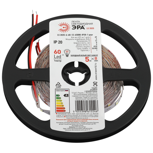 Светодиодная лента ЭРА LS2835 6-60-12-6500K-IP20-1 year-5m холодный белый свет со степенью защиты от пыли и влаги IP20 - современный способ создания внутреннего освещения, подсветки ниш, лестничного пространства, систем хранения, а также декоративного и художественного оформления любых объектов и форм в помещениях. Легко и быстро устанавливается на любой гладкой поверхности с помощью скотча, расположенного на оборотной стороне ленты. Используя алюминиевый профиль, можно создавать необычные и функциональные решения освещения в Вашем интерьере. Рабочее напряжение ленты составляет 12В, а мощность равна 6Вт/м. Светодиодная лента обладает световым потоком 400 Лм/м, и цветом свечения - холодный белый (6500 K)