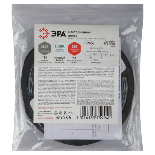 Светодиодная лента ЭРА LS2835 -9,6-120-12-6500K-IP65-1 year-5m (80/1440) со степенью защиты от пыли и влаги IP65 - современный способ создания внутреннего освещения, подсветки ниш, лестничного пространства, систем хранения, а также декоративного и художественного оформления любых объектов и форм в помещениях с повышенным уровнем влажности и уличного освещения. Легко и быстро устанавливается на любой гладкой поверхности с помощью скотча, расположенного на оборотной стороне ленты. Используя алюминиевый профиль, можно создавать необычные и функциональные решения освещения в Вашем интерьере. Рабочее напряжение ленты составляет 12В, а мощность равна 9,6 Вт/м. Светодиодная лента обладает световым потоком 840 Лм/м, и цветом свечения - холодный белый (6500 K)