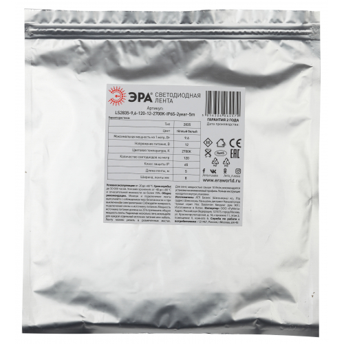 ЭРА Лента светодиодная LS2835-9,6-120-12-6500K-IP65-2year-5m (80/2400) со степенью защиты от пыли и влаги IP65 - современный способ создания внутреннего освещения, подсветки ниш, лестничного пространства, систем хранения, а также декоративного и художественного оформления любых объектов и форм в помещениях с повышенным уровнем влажности и уличного освещения. Легко и быстро устанавливается на любой гладкой поверхности с помощью скотча, расположенного на оборотной стороне ленты. Используя алюминиевый профиль, можно создавать необычные и функциональные решения освещения в Вашем интерьере. Рабочее напряжение ленты составляет 12В, а мощность равна 9,6 Вт/м. Светодиодная лента обладает световым потоком 1050 Лм/м, и цветом свечения - холодный белый (6500 K)