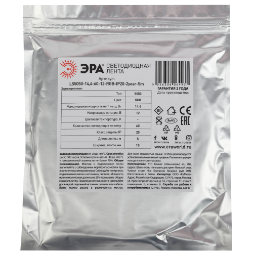 ЭРА Лента светодиодная LS5050-14,4-60-12-RGB-IP20-2year-5m (120/3600) со степенью защиты от пыли и влаги IP20 - современный способ создания внутреннего освещения, подсветки ниш, лестничного пространства, систем хранения, а также декоративного и художественного оформления любых объектов и форм в помещениях. Легко и быстро устанавливается на любой гладкой поверхности с помощью скотча, расположенного на оборотной стороне ленты. Используя алюминиевый профиль, можно создавать необычные и функциональные решения освещения в Вашем интерьере. Рабочее напряжение ленты составляет 12В, а мощность равна 14,4 Вт/м. Светодиодная лента обладает световым потоком , и цветом свечения - многоцветный (620/520/465 Нм)