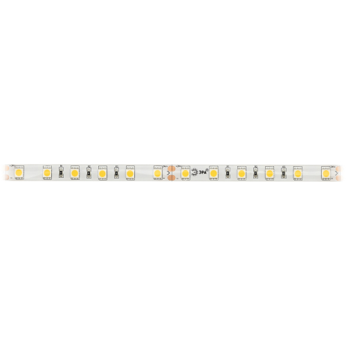 ЭРА Лента светодиодная LS5050-14,4-60-24-65-2700К-5m (50/800) со степенью защиты от пыли и влаги IP65 - современный способ создания внутреннего освещения, подсветки ниш, лестничного пространства, систем хранения, а также декоративного и художественного оформления любых объектов и форм в помещениях с повышенным уровнем влажности и уличного освещения. Легко и быстро устанавливается на любой гладкой поверхности с помощью скотча, расположенного на оборотной стороне ленты Используя алюминиевый профиль, можно создавать необычные и функциональные решения освещения в Вашем интерьере. Рабочее напряжение ленты составляет 24В, а мощность равна 14,4 Вт/м. Светодиодная лента обладает световым потоком 1000 Лм/м, и цветом свечения - теплый белый (2700 K)