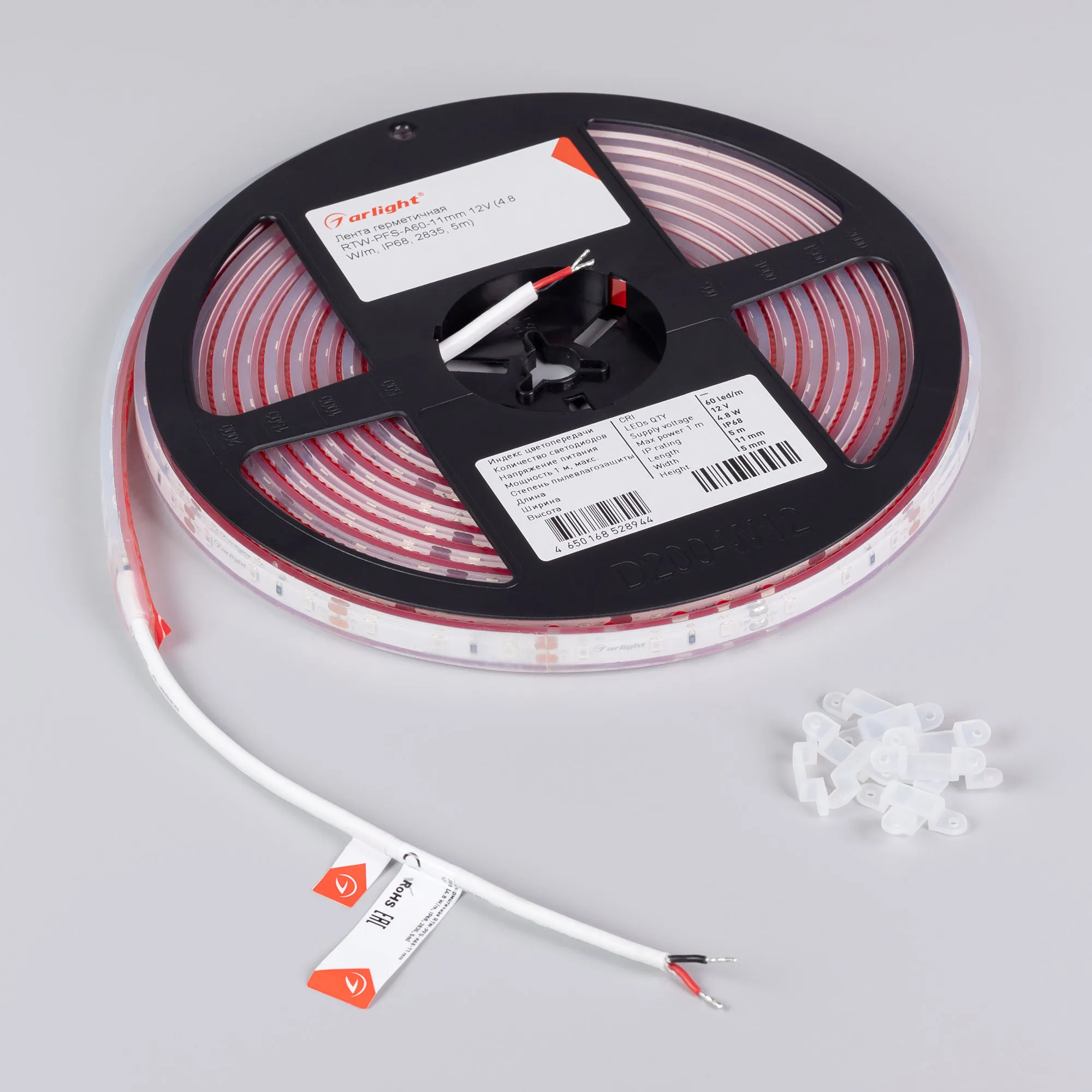 Светодиодная герметичная лента RTW серии A60 со степенью защиты IP68. Напряжение питания 12 В, мощность 4.8 Вт/м, ширина 11 мм. Светодиоды SMD 2835, 60 шт/м, красного цвета свечения. Минимальный отрезок 50 мм (3 светодиода). Применяется для декоративной подсветки любых жилых, коммерческих помещений, декоративной подсветки интерьеров, потолочных ниш, рабочих зон кухни, влажных зон, мебели, рекламных конструкций и витрин. В комплекте силиконовые скобы для установки.