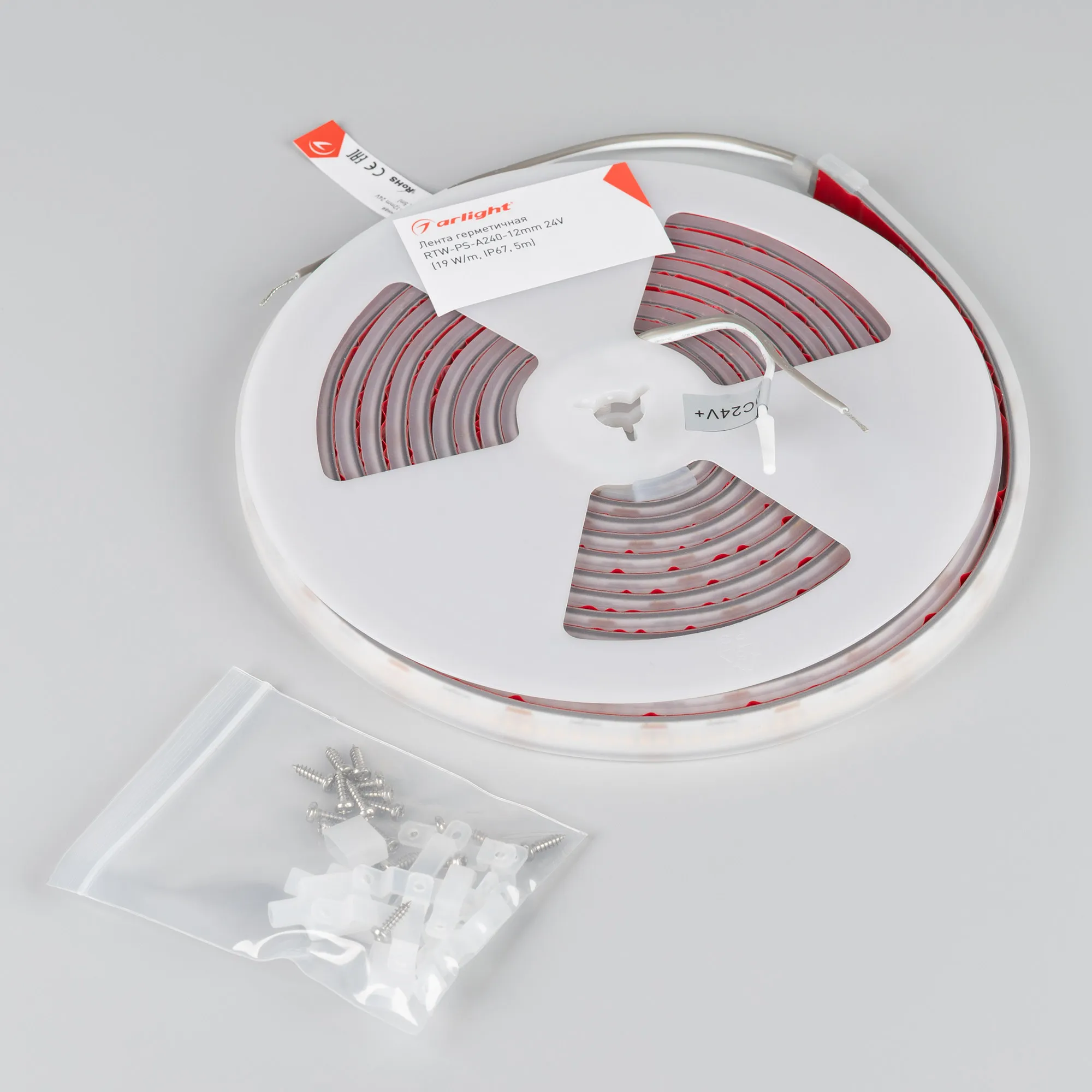 Светодиодная герметичная лента RTW серии A240 со степенью защиты IP67, силиконовая экструзия. Напряжение питания 24 В, мощность 19 Вт/м, ширина 12 мм. Светодиоды SMD 2835, 240 шт/м, дневного цвета свечения (4000K). Высокий индекс цветопередачи CRI>90 обеспечивает точное восприятие цветов и оттенков при освещении любых жилых и коммерческих помещений. Лента применяется для создания основного освещения и декоративной подсветки в интерьере и экстерьере, подсветки рекламных конструкций и витрин, наружной подсветки зданий. Идеальна для создания световых линий с равномерной засветкой и светильников на базе алюминиевого профиля. В ленте используется технология ReelToReel, обеспечивающая производство ленты без пайки и повышающая ее механическую прочность. В комплекте силиконовые клипсы 10 шт, силиконовые заглушки глухие 2 шт, силиконовые заглушки под провод 2 шт. Обязательна установка на профиль.
