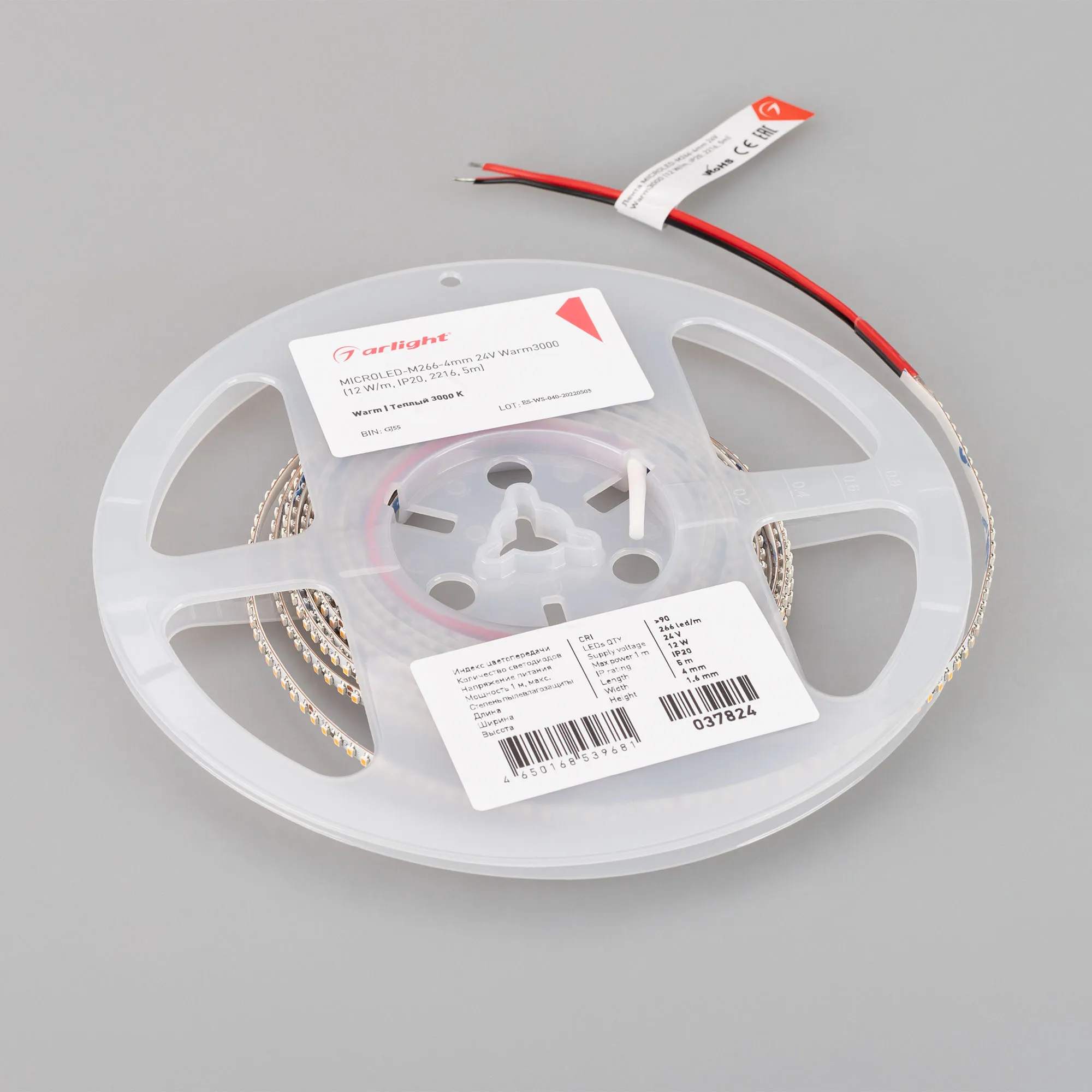 Узкая светодиодная лента MICROLED серии M266 шириной 4 мм, тип светодиода SMD 2216, 266 светодиодов на метр мощностью 12 Вт/м, теплого цвета свечения (3000K). Высокий индекс цветопередачи CRI>90 позволяет точно передать цвета при освещении любых жилых и коммерческих помещений, минимальный отрезок 26.4 мм (7 светодиодов). Универсальная лента для организации декоративной подсветки в помещениях, подсветка лестниц, ступеней, плинтусов, ниш, мебельных полок, натяжных потолков и витражей. Узкая плата позволяет установить ленту в тонкий паз. Используется для рекламных конструкций и витрин. Обязательна установка на профиль.