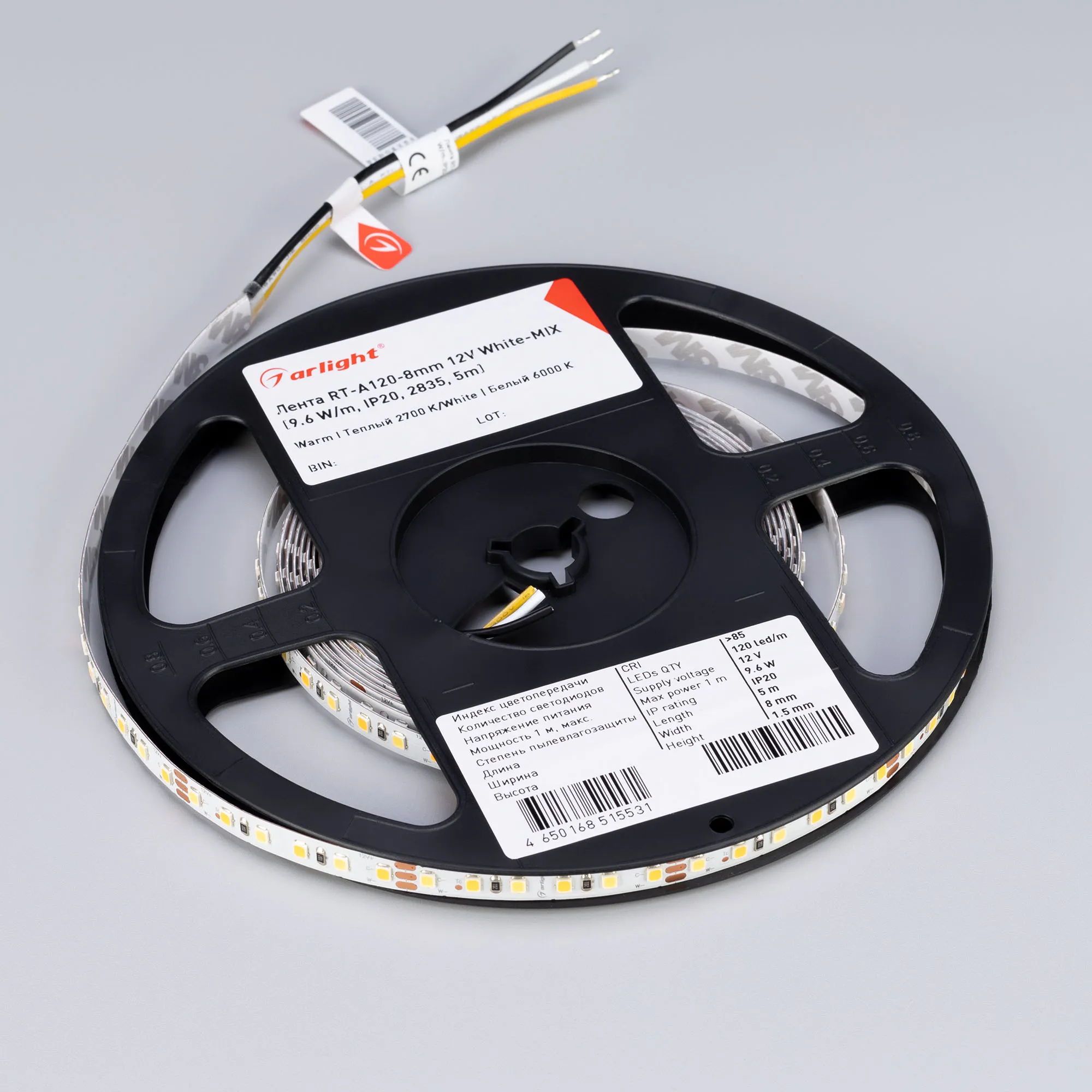 Светодиодная лента RT серии A120 шириной 8 мм, мощностью 9.6 Вт/м, с изменяемым цветом белого свечения в широком диапазоне (MIX) от теплого (2700K) до белого (6000K). Напряжение питания 12 В. Светодиоды SMD 2835 (120 шт/м). Индекс цветопередачи CRI>85. Минимальный отрезок 50 мм (6 светодиодов). Двухканальная лента с тремя проводами для подключения, управляется любым MIX-контроллером. Применяется для создания биодинамического освещения, декоративной подсветки элементов интерьера, ниш, рекламных конструкций, витрин, рабочих зон, зон отдыха, мебели.