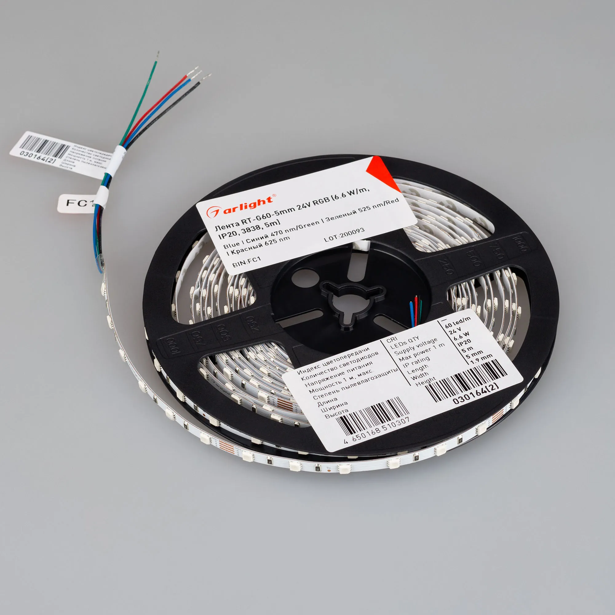 Мультицветная светодиодная лента RT серии G60 шириной 5 мм, мощностью 6.6 Вт/м. цвет свечения RGB. Напряжение питания 24 В. Светодиоды SMD 3838 (60 шт/м). Минимальный отрезок 100 мм (6 светодиодов). Трехканальная лента с 4 проводами для подключения, управляется RGB-контроллером. Применяется для создания яркой цветной декоративной подсветки элементов интерьера, ниш, рекламных конструкций, витрин, зон отдыха. Обязательна установка на профиль.