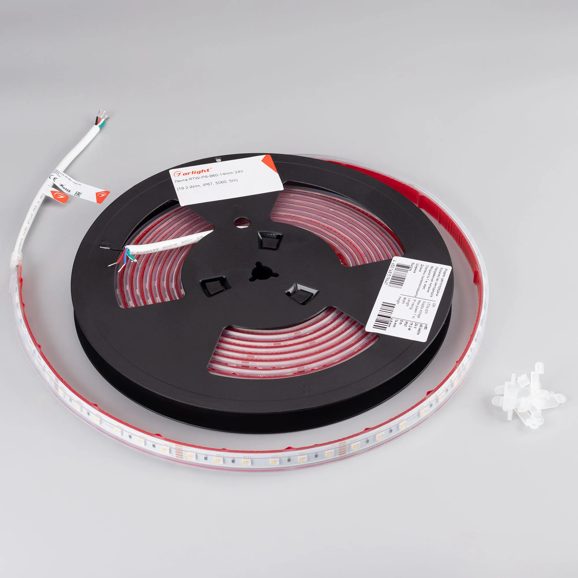 Мультицветная светодиодная герметичная лента RTW серии B60 мощностью 19.2 Вт/м, IP67 - силиконовая экструзия. Светодиоды SMD 5060, 60 шт/м, четыре цвета свечения в одном корпусе: RGB, теплый 3000K с индексом цветопередачи CRI>85. Напряжение питания 24 В. Предназначена для декоративной подсветки ниш, элементов интерьера. Применяется для создания световых линий с изменяемым цветом свечения. Четырехканальная лента с пятью проводами для подключения, технология моночип 4-in-1 дает идеальное смешение цветов. Равнозначные мощности на всех четырех каналах значительно упрощает работу с любым RGBW-контроллером. Минимальный отрезок 100 мм (6 светодиодов). В комплекте силиконовые клипсы для установки (10шт).