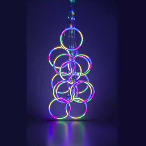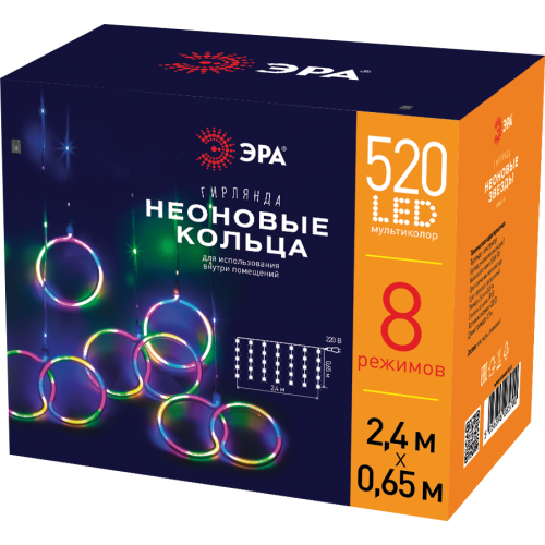 Новогодняя гирлянда светодиодная ЭРА "Неоновые кольца" 2.4х0.65 м EGNIG-RI (арт. Б0051878) создаст дома неповторимую атмосферу к Новому году и Рождеству! Гирлянда штора особенно красиво будет смотреться на окне. Данная модель состоит из 520 светодиодов с разноцветным светом (мультиколор), фигурки выполнены в форме одинарных и двойных колец. Электрогирлянда дождик имеет незаметные полупрозрачные провода, длина кабеля составляет 1.5 метра, класс защиты IP20 (использование внутри помещений), питание 220 В. Гирлянда LED ЭРА прослужит долгие годы, станет универсальным украшением гостиной, кухни, спальни или другого пространства, а еще это отличный подарок для Ваших любимых! Новогодний декор для дома всегда вдохновляет и дарит настроение праздника!
