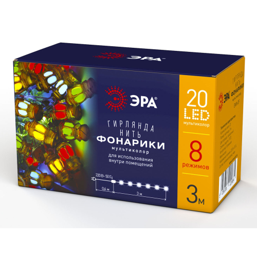 Новогодняя светодиодная гирлянда ЭРА "Фонарики" (арт. Б0041897) поможет быстро и просто украсить к праздникам дом, офис или общественное пространство. 20 ламп этой гирлянды представляют собой миниатюрные разноцветные фонарики. Внутри каждого фонарика - яркие светодиоды. Эта 3-метровая гирлянда с 8 режимами работы отлично выглядит как во включённом, так и в выключенном состоянии. Стилизованные под уличный ретро-фонарь лампочки сами по себе являются украшением пространства. По сути эта гирлянда 2 в 1: ёлочные игрушки + иллюминация. Вы можете украсить ёлку одной лишь гирляндой ЭРА "Фонарики" - и новогоднее дерево уже будет иметь нарядный завершённый вид. LED-технология минимизирует затраты на электроэнергию, используйте эту гирлянду в течение всех новогодних праздников без страха получить большие счета. Создавайте праздничное настроение вместе с ЭРА!