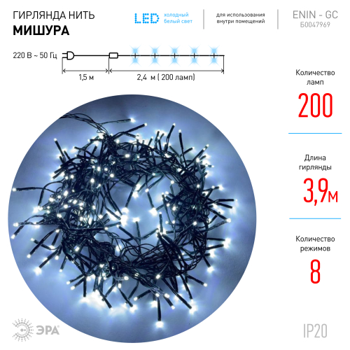 Новогодняя гирлянда-нить ЭРА "Мишура" с холодным белым светом отлично подходит для зимних праздников, в помещении она создает эффект мерцающего снегопада. Длина световой части - 2,4 метра, расстояние от вилки до первой лампочки - 1,5 метра. Гирлянда работает от стандартной электросети 220 В и потребляет минимальное количество электроэнергии. В ней установлено 200 светодиодов последнего поколения, это яркие и одновременно экономичные источники света. Гирлянда неслучайно называется "Мишура" - лампочки на ней расположены очень часто, ее свет выглядит объемно и "пушисто". Красивая и практичная LED-гирлянда ЭРА "Мишура" - идеальное решение, чтобы украсить елку, дом, создать атмосферу на праздничной вечеринке. Под настроение выбирайте любой из 8 режимов свечения.