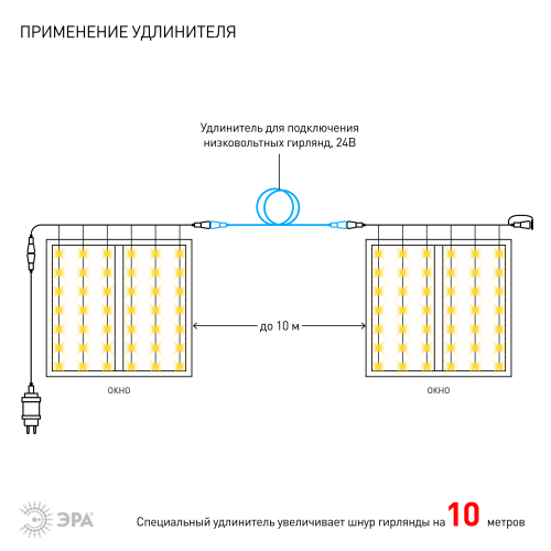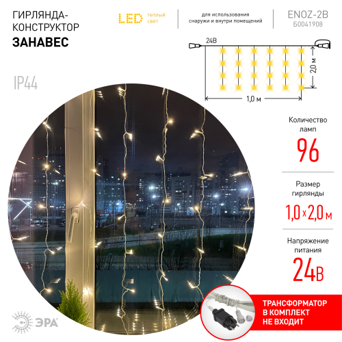 Праздничная светодиодная гирлянда ЭРА "Занавес" для использования внутри и снаружи помещений. Защищена от влаги и пыли (IP44), морозостойка - можно использовать на улице в регионах с низкими температурами. Идеальное решение для украшения окон, имеет оптимальные размеры: 2 х 2 м. На полупрозрачных малозаметных проводах размещены 96 ярких экономичных светодиодов с уютным тёплым светом. Стильная аккуратная гирлянда ЭРА "Занавес" создаёт позитивное настроение и незабываемую атмосферу в доме, офисе, общественном пространстве. Применяется для новогодней иллюминации, оформления праздников, дизайна фотозон. Ещё одно преимущество - специальный разъём для сопряжения с другими гирляндами. Такая модульная конструкция позволяет соединять в единую цепь до 5 гирлянд ЭРА "Занавес", формируя длинный световой ряд для максимально эффектной иллюминации. Современная светодиодная технология экономит до 90% электроэнергии. Гирлянда отвечает требованиям пожарной безопасности, работает от трансформатора. Трансформатор ЭРА, преобразующий входное напряжение 210-240 вольт в выходное 24 В: http://www.eraworld.ru/catalog/2647679