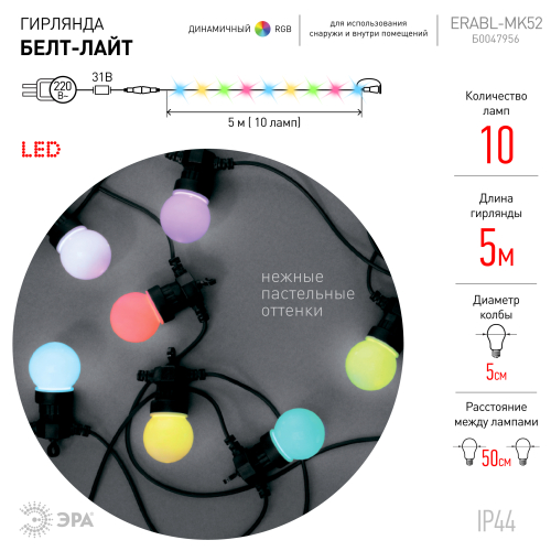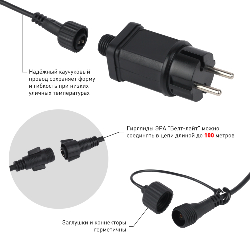 Уникальная для российского рынка гирлянда, которая своим необычным свечением способна заворожить. Внутри каждой лампочки несколько RGB-светодиодов, которые светят разными цветами, плавно меняя оттенки. В многоцветной новогодней иллюминации мы привыкли видеть несколько базовых ярких цветов. Здесь же целая палитра, состоящая преимущественно из нежных пастельных оттенков. Праздничная гирлянда ЭРА "Белт-лайт" - современный высокотехнологичный аналог традиционных гирлянд-шариков. Поможет стильно и душевно украсить дом, сад или общественное пространство, вызовет приятные ностальгические эмоции, удивит качеством и удобством в использовании. Подходит для применения внутри и снаружи помещений. Колбы не из хрупкого стекла, а из устойчивого к механическим воздействиям и низким температурам пластика. Лёгкие и прочные плафоны не разобьются при транспортировке, использовании и хранении. Надёжный каучуковый провод сохраняет форму и гибкость при низких уличных температурах. Гирлянды ЭРА "Белт-лайт" можно соединять в длинные цепи - до 4 гирлянд в одной цепи. Заглушки и коннекторы герметичны. В каждый набор входит комплект для подключения и соединения. Создавайте праздничное настроение вместе с ЭРА!