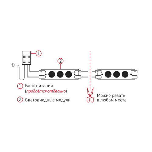 Цепочку LED-модулей можно обрезать после любого модуля без нарушения его работы по оставшейся длине.