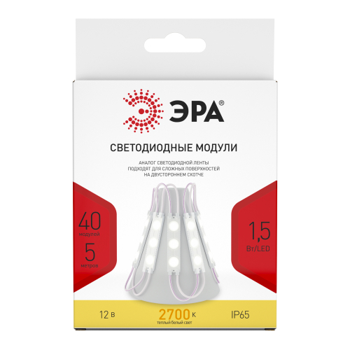 В упаковке находится 5 метровая лента из 40 модулей, на каждом модуле расположено по 3 светодиода с цветовой температурой 2700 К. Степень защиты модулей: IP65 применение внутри и снаружи помещений.
