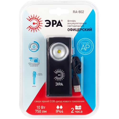 ЭРА АР RA-802 "ОФИЦЕРСКИЙ" - усовершенствованная модель традиционного офицерского фонаря. При своих компактных размерах дает очень яркий свет мощностью 10 Вт. Корпус изготовлен из алюминия, имеются защитные резиновые вставки. Светоотражатель с линзой для широкого угла освещения. Кнопка включения яркого красного цвета расположена в боковой части корпуса, покрыта мягким прорезиненным материалом. Типы крепления: прищепка для нагрудного кармана, ремня сумки (с внутренними резиновыми вставками, которые надежно фиксируют устройство даже на гладкой скользкой поверхности); встроенный крючок для подвешивания; магнит для закрепления на металлических поверхностях. Фонарь заряжается от USB, кабель в комплекте. Одного полного заряда хватает на 2 часа непрерывного свечения. Есть возможность выбора яркости света (плавное диммирование). Дальность светового луча - 85 метров.