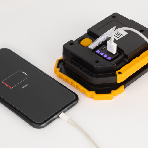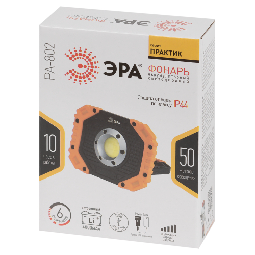 Фонарь защищен от влаги и пыли по международному классу IP44. Выполнен из ударопрочного пластика в стильном сочетании черного и желтого цветов, имеет эффектный прямоугольный дизайн. Кабель для USB-подзарядки в комплекте. ЭРА PA-802 - это фонарь-powerbank, его можно использовать для подзарядки мобильных устройств. Литиевый аккумулятор с отличной емкостью - 2400 мАч. После подзарядки непрерывно работает 10 часов. Есть индикация заряда-разряда.