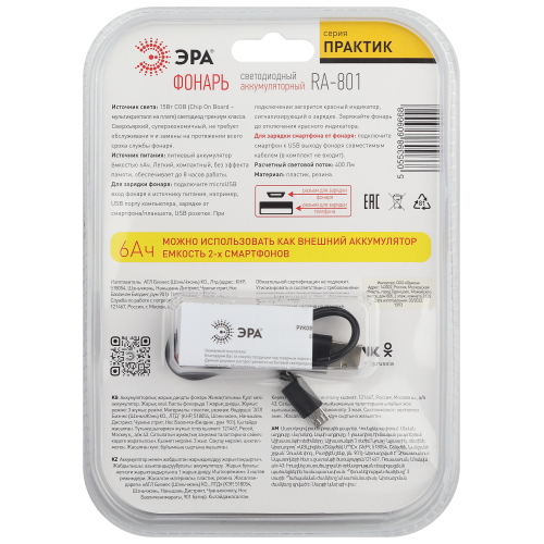 ЭРА RA-801 мощный фонарь-powerbank с литиевым аккумулятором. Яркий свет + возможность оперативно подзарядить любое мобильное устройство. Два функциональных гаджета в одном! Незаменимая вещь в путешествии, за городом, на строительных и ремонтных работах. Мощный литиевый аккумулятор 6 000 мАч - гарантия бесперебойной работы устройства в течение 8 полных часов. USB-шнур в комплекте.