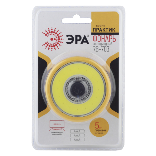 Резиновый чехол не только надежно удерживает фонарь на поверхности, но и защищает его от падений. Дополнительная гарантия долговечности - корпус из ударопрочного пластика. ЭРА RB-703 работает от трех батареек АА.