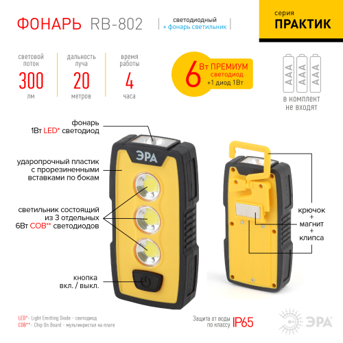ЭРА RB-802 яркий светодиодный фонарь, который не боится воды (IP65 - защита от дождя и брызг). По периметру корпуса - прорезиненное покрытие, которое защищает устройство при возможных падениях и тряске. На лицевой стороне - 3 премиум-светодиода общей мощностью 6 Вт. Каждый из них расположен в индивидуальном гнезде - в случае повреждения одного из элементов, пользователь не останется без света. На торце - дополнительный LED-элемент мощностью 1 Вт. RB-802 можно использовать в двух режимах: направленный свет (фонарь с дальностью 20 метров) и рассеянный заливающий свет (светильник). Встроены три вида крепления к разным поверхностям - крючок, магнит и клипса. ЭРА RB-802 непрерывно работает без подзарядки в течение 4 часов.