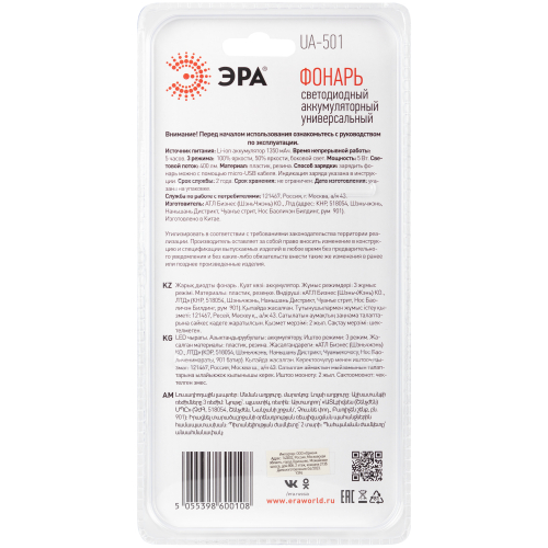 ЭРА UA-501 универсальный светодиодный фонарь, работающий от встроенного аккумулятора. Одной подзарядки хватает на 5 часов непрерывного свечения. Корпус из прочного пластика и мягкой резины. Имеет защиту от влаги и пыли (IP44). Выпускается в современной блистерной упаковке.