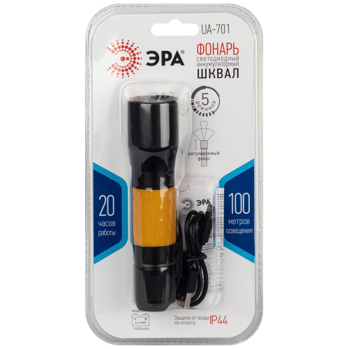 ЭРА UA-701 «Шквал» - ручной аккумуляторный LED-фонарь мощностью 5 Вт. Несколько режимов работы (100% яркости, 50% яркости, 25% яркости, стробирование, SOS) делают этот светодиодный фонарь незаменимым помощником в работе, в быту, в загородном отдыхе. LED-фонарь защищён от влаги и пыли (IP44), что позволяет с успехом применять его на открытом воздухе, в помещениях с повышенной влажностью или с высоким содержанием в воздухе строительной пыли. Светодиодный фонарь отличается удобной подзарядкой (Type-C), заряжается за 3 часа, держит заряд до 20 часов. Дополнительное преимущество – регулировка фокусировки луча.