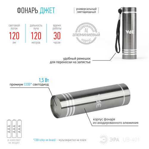 Универсальный светодиодный фонарь "Джет" с корпусом из анодированного алюминия. Такой корпус очень надёжный, не подвергается коррозии, очень прочный и долговечный. Этот фонарь компактный и очень простой, он создан для повседневного использования в быту. Именно поэтому он сделан из качественного материала.Особенность светодиодных фонарей ЭРА - светодиоды нового поколения. В фонаре "Джет" использованы светодиоды премиум класса, они на 50% ярче стандартных и имеют цветовую температуру 6000К. Это значит, фонарь светит ярким белым светом, приближенным к естественному, и не отдаёт в синеву. Фонарь обеспечивает до 30 часов непрерывной работы с мощностью в 1,5 Вт. Этого более чем достаточно для использования в городских условиях. Дальность луча "Джет" - 120 метров. Фонарик легко носить и хранить, с ремешком, который позволит прицепить фонарик к карману или повесить на сумку. "Джет" - маленький, качественный фонарик для самых разных бытовых нужд.