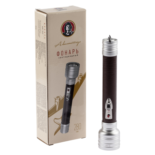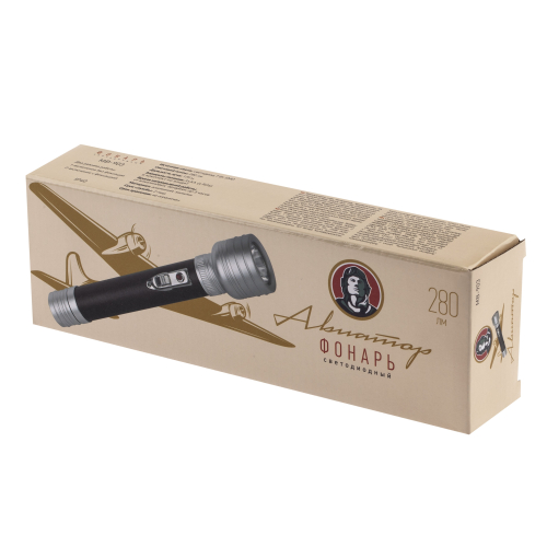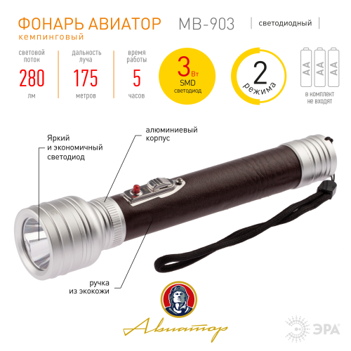 ЭРА "Авиатор" МВ-903 яркий светодиодный фонарь с оформлением в стилистике прошлого столетия и современной технической начинкой. Отличается повышенной дальностью луча до 175 метров. Корпус из прочного анодированного алюминия устойчив к механическим повреждениям. Удлинённая ручка покрыта экокожей тёмно-коричневого цвета. Фонарь отлично лежит в руке, не скользит, кнопка включения эргономично расположена прямо под большим пальцем. Трёх пальчиковых батареек хватает на 5 часов непрерывного свечения. Эффектный внешний вид, качественный свет и красивая дизайнерская упаковка в этом фонаре всё на самом высоком уровне.