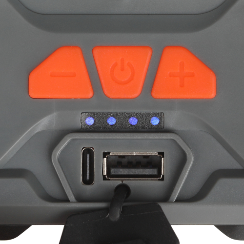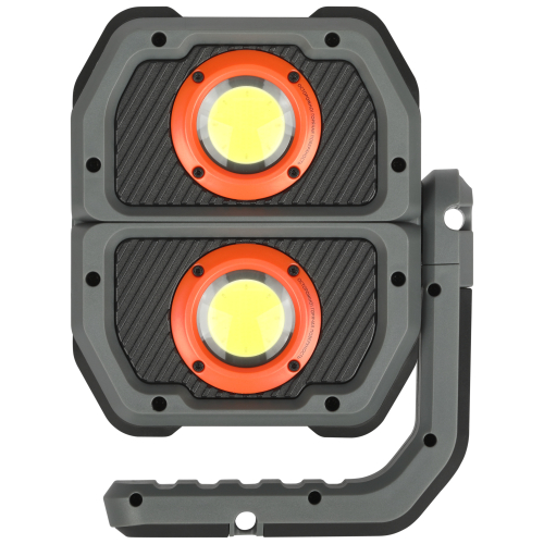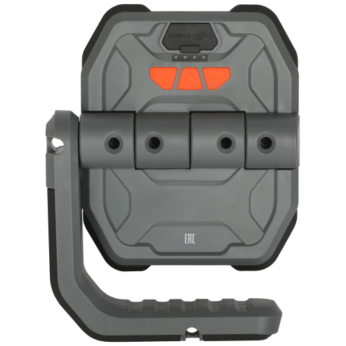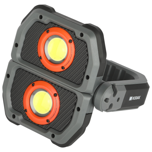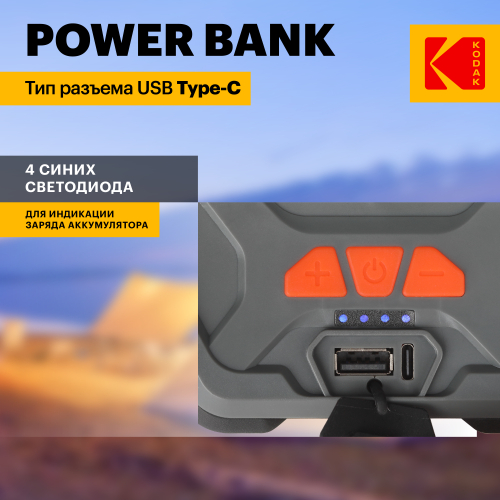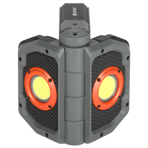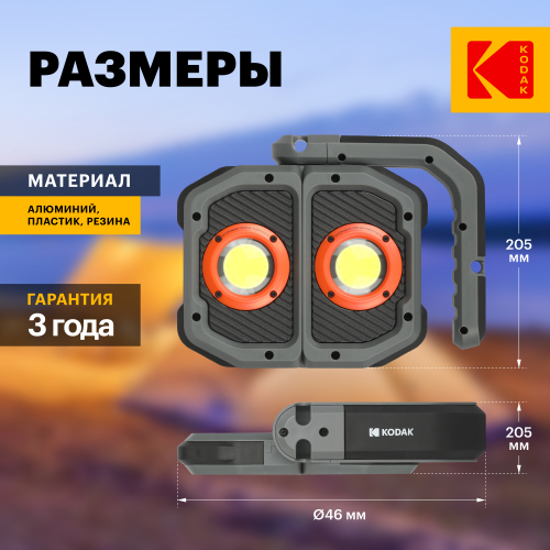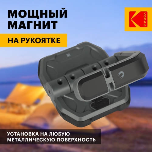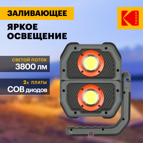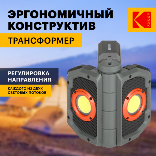 Многофункциональный светодиодный фонарь-прожектор от признанного мирового бренда — Kodak RA-1001. Яркое заливающее освещение со световым потоком 3800 лм создают две светодиодные платы CОB. Для более продолжительной работы можно использовать только одну плату СОВ. Технология COB ("мультикристалл на плате") обеспечивают высокую яркость и отличное качество света — ровное, без пульсаций. Световой поток фонаря можно плавно регулировать при помощи специальных прорезиненных кнопок "+" и "-". В матрицу светодиодов добавлены светодиоды красного свечения. Режим красного свечения активизируется при длительном (3-5 сек.) нажатии на кнопку включения. Повторное нажатие на кнопку переводит фонарь в режим красного стробоскопа. На панели управления фонарём располагаются 4 синих светодиода, которые указывают на степень заряда аккумулятора при зарядке через порт "Type C". Надежная резиновая накладка также защищает порт USB. Фонарь можно использовать в качестве powerbank. Рукоятка фонаря оснащена мощным магнитом, поэтому фонарь можно устанавливать на любую металлическую поверхность. Также в рукоятке есть два сквозных отверстия для возможности подвешивать фонарь. Специальное отверстие с резьбой в корпусе фонаря позволяет использовать штатив при работе. Портативный фонарь имеет эргономичный конструктив формата "трансформер" и позволяет регулировать направление каждого из двух световых потоков. Это даёт возможность успешно применять данный LED-фонарик в самых разных ситуациях — от выполнения профессиональных задач до организации походного освещения на привале.