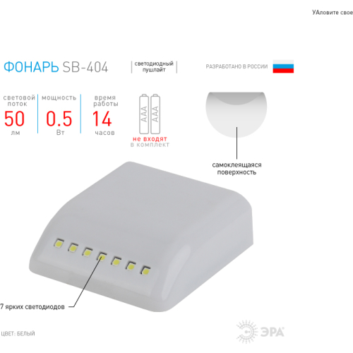 ЭРА SB-404 светодиодный фонарь-подсветка, который сделает быт более комфортным. Быстро и просто устанавливается в кухонные, платяные или гардеробные шкафы. Крепится на самоклеящиеся липучки или болты, поставляемые в комплекте. В корпус из легкого прочного пластика встроены 7 ярких светодиодов, которые освещают 1 метр пространства. Фонарь отлично подсвечивает полки и отдаленные углы, поможет быстро найти в шкафах нужные предметы и оптимизировать хранение. Работает от двух пальчиковых батареек (2 х АAА). Одного комплекта элементов питания хватает на 14 часов непрерывного свечения. С учетом того, что подсветка используется не постоянно, установленных однажды батареек будет достаточно на годы использования фонаря.