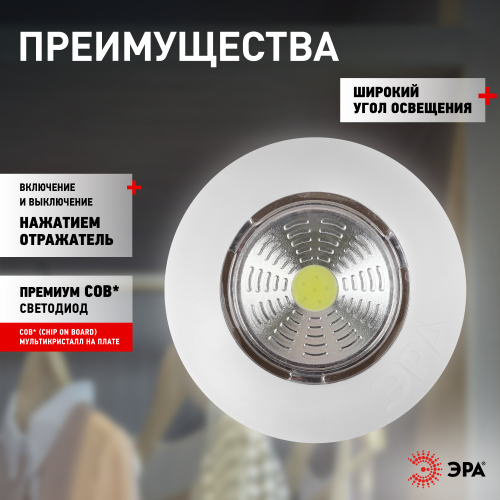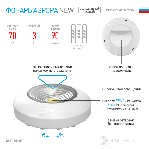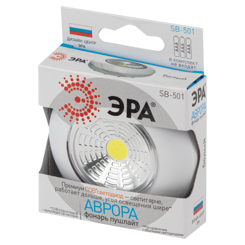 Фонарь SB-501 пушлайт "Аврора" - светодиодный самоклеящийся фонарь-подсветка, который включается простым нажатием руки. В фонаре использованы светодиоды нового поколения, который светят мягким светом, не мерцают, не нагреваются и имеют длительный срок службы, не нуждаются в замене. Эти светодиоды светят ярким белым светом и намного энергоэффективнее обычных. Дальность луча составляет 5 метров.Это удобный и практичный фонарь, который можно использовать для декоративного освещения в качестве подсветке или как аварийный свет. Фонарь выполнен в лаконичном дизайне в базовом белом цвете из ударопрочного экологичного пластика. Фонарь не требует установки, достаточно отклеить стикер от самоклеящейся поверхности и приклеить фонарь туда, где требуется дополнительное освещение. Компактные размеры позволяют приклеить фонарь на любые плоские поверхности, такие как лестницы, коридоры, прихожие, шкафы, тумбочки, кладовки. Он также подходит для машин, лодок и кемпинга. Фонарь работает от батареек, которые очень легко сменить, не отклеивая фонарь, а лишь открутив корпус.