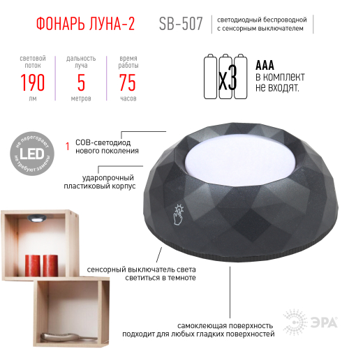 Светодиодный беспроводной самоклеящийся фонарь-подсветка с сенсорным выключателем для хозяйственно-бытовых помещений. Современные яркие и экономичные COB-светодиоды светят также ярко, как лампа накаливания 20Вт и не требуют замены в течение всего срока службы фонаря. Включается и выключается от прикосновения к сенсору. Сенсор светится в темноте (светонакопитель). Самоклеящаяся поверхность позволяет устанавливать подстветку под любым углом на любых гладких поверхностях. Удобная смена батареек без отклеивания фонаря от поверхности.