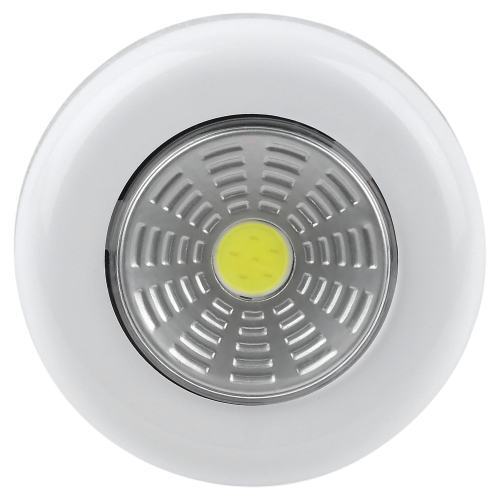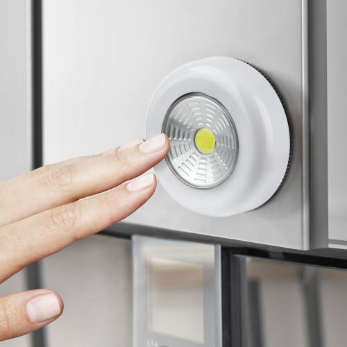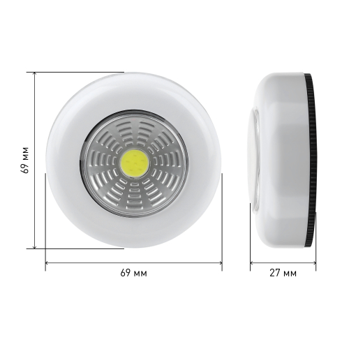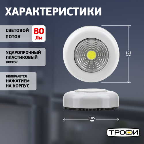 Светодиодный пушлайт ТРОФИ включается и выключается лёгким нажатием на корпус. Работает от 3 мизинчиковых батареек ААА. Одного комплекта алкалиновых элементов питания хватит на 5 часов непрерывной подсветки. Светит ярко благодаря современному COB-светодиоду. Источник света не перегорает и не тускнеет со временем. За счёт эргономичной круглой формы, малого веса и базового белого цвета фонарик прекрасно смотрится в любом интерьере.