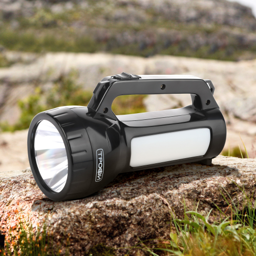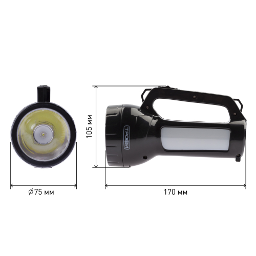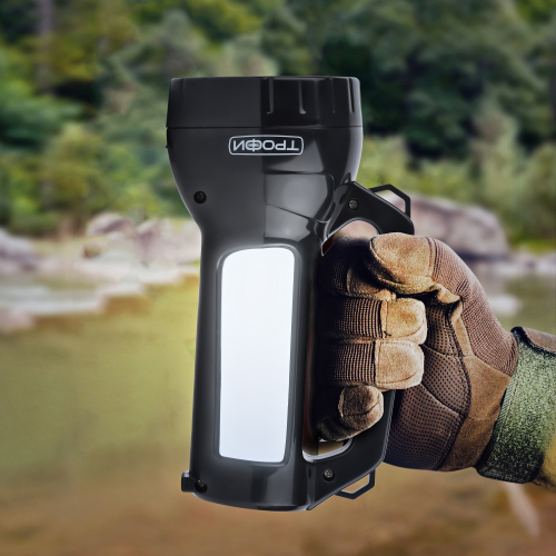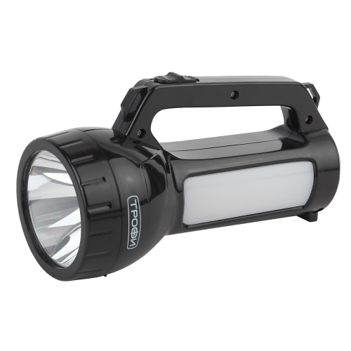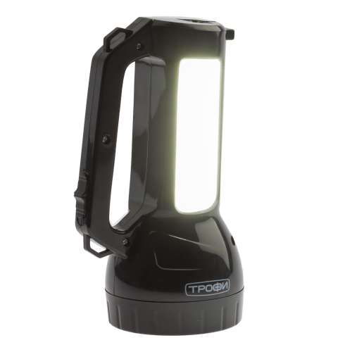 Трофи PA-504 ручной аккумуляторный фонарь с боковым светильником. Во фронтальной части установлен мощный SMD-диод с дальним направленным светом, светильник состоит из 12 светодиодов с заливающим ближним светом. Для работы фонаря не требуются батарейки, одной подзарядки устройства хватает на 4 часа непрерывной работы. Эргономичная ручка, кнопка включения прямо под большим пальцем. С помощью этого простого в управлении фонаря можно эффективно освещать путь или организовать освещение на привале, поставив Трофи PA-504 на ровную поверхность в качестве настольного светильника.