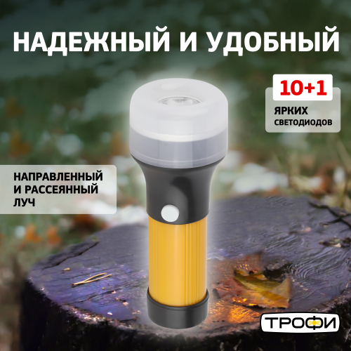 Трофи TB10S - компактный и лёгкий универсальный фонарь с двумя типами света. Корпус изготовлен из ударопрочного пластика. Дальний направленный световой луч и режим светильника. Это универсальный фонарь, который можно всегда брать с собой - и качественный ровный свет будет под рукой в нужной ситуации. Есть возможность выбирать нужный тип освещения: базовый LED-элемент обеспечивает направленный световой луч дальностью 35 метров, а 10 SMD-светодиодов, расположенных по кругу, формируют рассеянный заливающий свет по типу светильника. Трофи TB10S работает от 3 пальчиковых батареек (АА) в течение трёх активных часов. Корпус изготовлен из ударопрочного материала - не подвержен механическим повреждениям при ударах и падениях. Фонарь выполнен в сочетании контрастных цветов - чёрного и оранжевого.