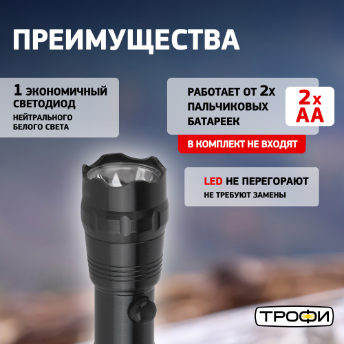 Трофи ТМ1W - компактный светодиодный фонарь с удобной удлинённой ручкой. Корпус изготовлен из прочного анодированного алюминия. Универсальный лаконичный дизайн, базовый чёрный цвет. Хорошая дальность светового луча. Этот фонарь с удлинённой ручкой не только удивительно удобен в использовании, но и прослужит долго. Корпус из прочного анодированного алюминия не боится падений и ударов, устойчив к возникновению царапин и сколов. Трофи ТМ1W будет выглядеть, как новый, даже спустя годы. Нацелен на долгосрочную работу и современный светодиод. Он не перегорит, не потускнеет со временем и не потребует замены. Мощность (1 Вт) и качество LED-элемента обеспечивают высокие для такого небольшого фонаря световые характеристики: дальность луча - 50 метров, световой поток - 60 лм. От двух алкалиновых пальчиковых батареек (АА) Трофи ТМ1W работает 3 активных часа. Простой в управлении, этот фонарь отлично подойдёт для использования в быту, пригодится в поездках, на охоте, рыбалке, походах в лес и горы.