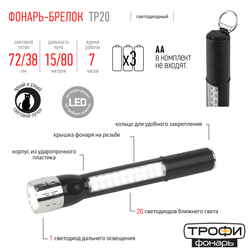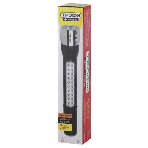 Трофи TP20 - кемпинговый фонарь-светильник с 21 белым светодиодом. Снабжён кольцом для удобного закрепления в полевых условиях. Корпус из ударопрочного пластика. Высокая дальность светового луча. От одного комплекта алкалиновых батареек работает 7 активных часов. Трофи TP20 - это устройство 2 в 1: фонарь + светильник. Яркий базовый светодиод, находящийся в головной части корпуса, даёт направленный луч высокой дальности - 80 метров. 20 LED-элементов светильника расположены в боковой части в два ряда - они обеспечивают широкое заливающее ближнее освещение, благодаря которому устройство функционирует как полноценный светильник. Между режимами легко переключаться при помощи кнопки включения - фонарь очень прост в управлении. Его можно смело брать с собой в дорогу, в поход, на охоту или рыбалку - корпус из ударопрочного пластика выдержит тряску, возможные удары и падения. Свет высокой дальности поможет отлично освещать путь и предметы в темноте, а светильник создаст уютную атмосферу на привале. Одного ко