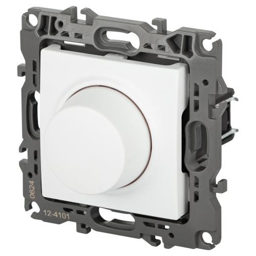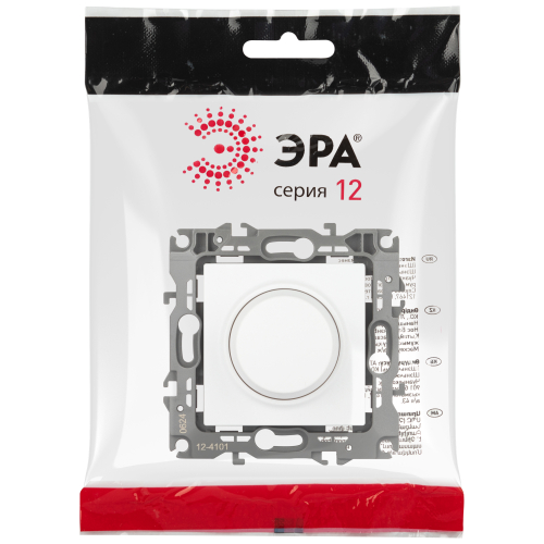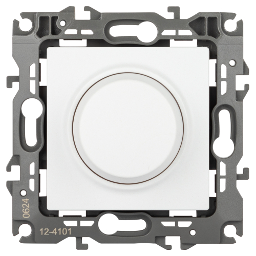 Светорегулятор поворотно-нажимной серии Эра 12 скрытой установки механизм цвет белый матовый 12-4101-01М. Номинальные хар-ки 400ВА 230В. Сделан из поликарбоната. Монтаж в подрозетник производится и на лапки, и на винты. Рамки приобретаются отдельно.