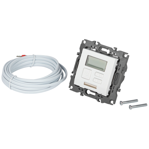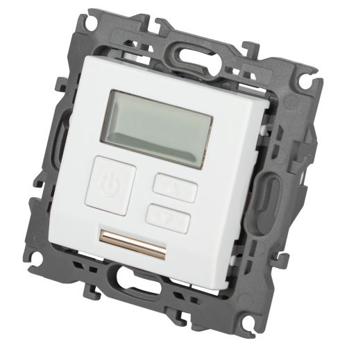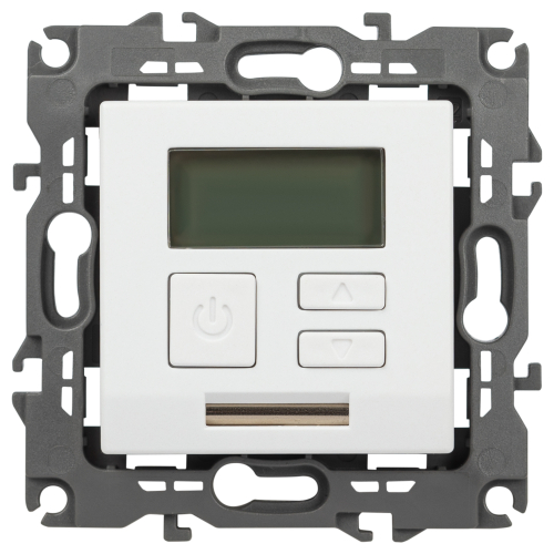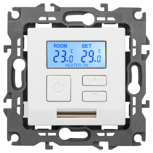Терморегулятор теплый пол / отопление электронный серии Эра 12 скрытой установки механизм цвет белый матовый 12-4111-01М. Номинальные характеристики 16А 230В. Сделан из поликарбоната. Монтаж в подрозетник производится и на лапки, и на винты. Рамки приобретаются отдельно.