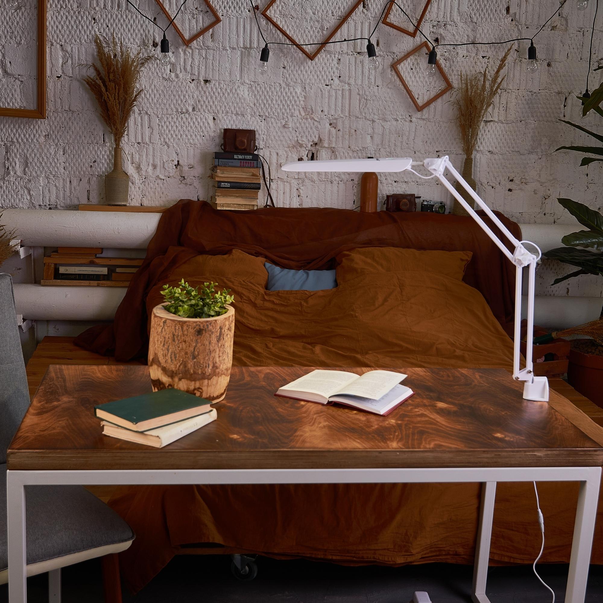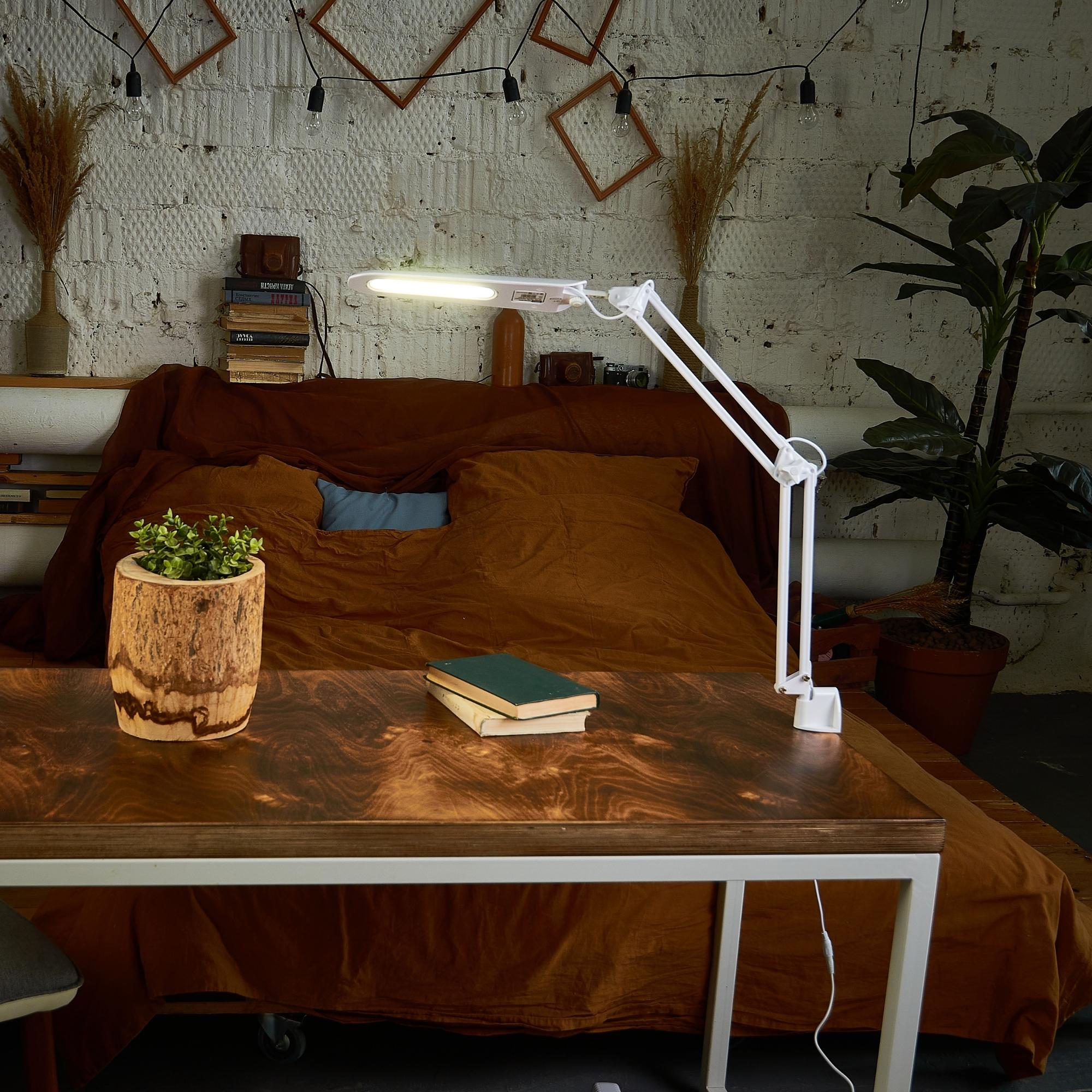 Светильник настольный светодиодный на струбцине TLD-524 White/LED/500Lm/4500K/Dimmer предназначен для освещения рабочего места. Не требует сборки. Гибкая ножка позволяет регулировать угол наклона и высоту светильника. Сенсорный выключатель с диммером расположен на плафоне светильника. С помощью диммера можно регулировать уровень яркости светильника. Мощность - 8 Вт, что соответствует мощности лампы накаливания 50 Вт. Световой поток - 500 лм, цветовая температура - 4500 К. Светильник изготовлен из металла и пластика, стойка полностью металлическая, цвет корпуса - белый. Требуется подключение к электросети. Лаконичный и стильный дизайн светильника впишется в любой интерьер. Удобное крепление-струбцина позволяет надежно зафиксировать светильник на столе. Требуется подключение к электросети. В комплект поставки входят блок питания и провод длиной 1,9 м. Габариты светильника - ДхШхВ 400х50х560 мм. Общий вес комплекта - 967 г. Гарантия - 2 года. Срок службы светильника - 50 000 часов.
