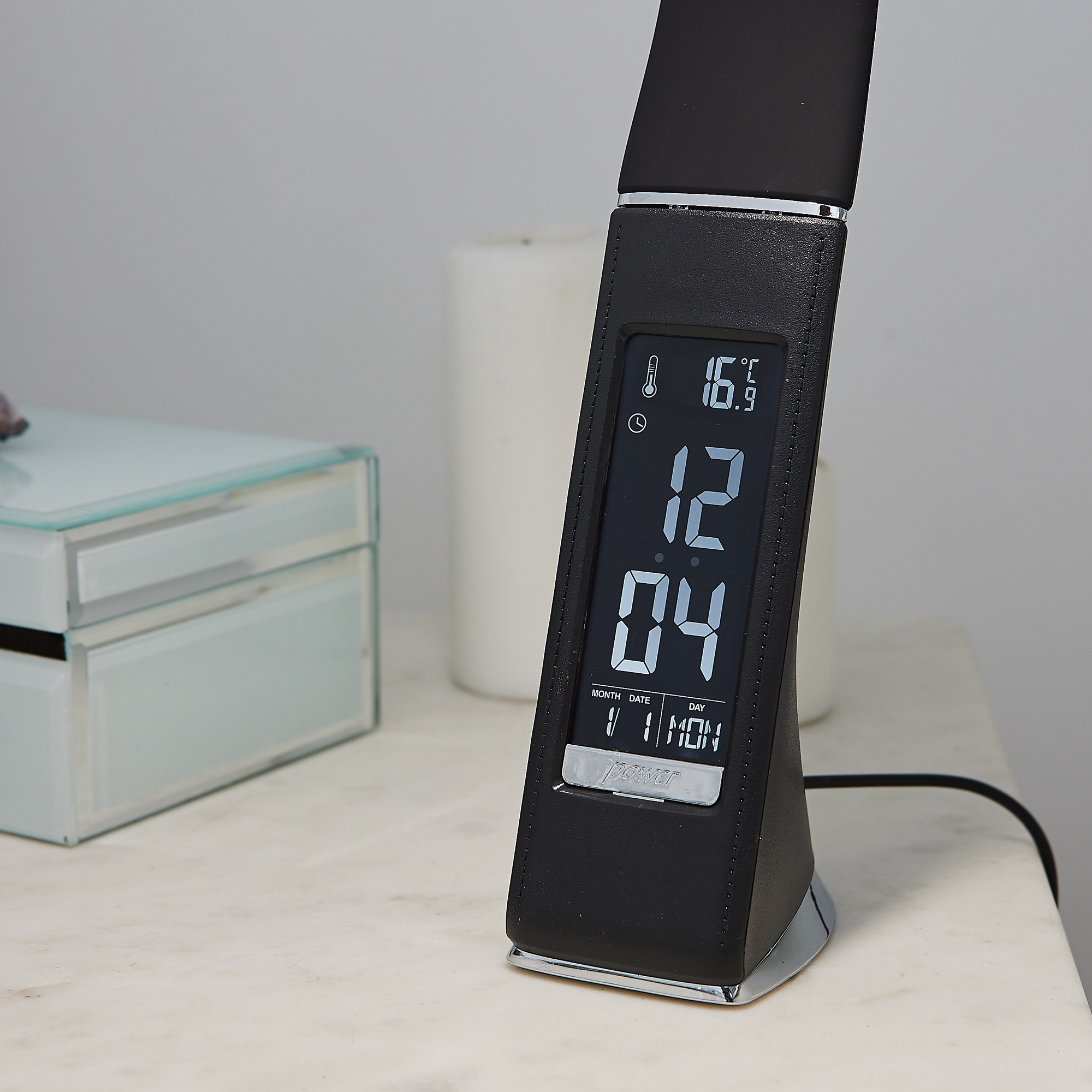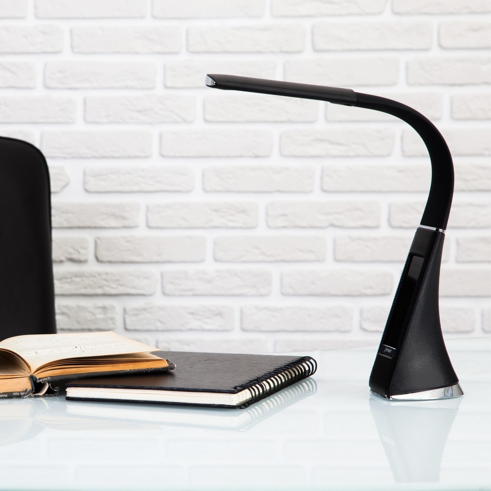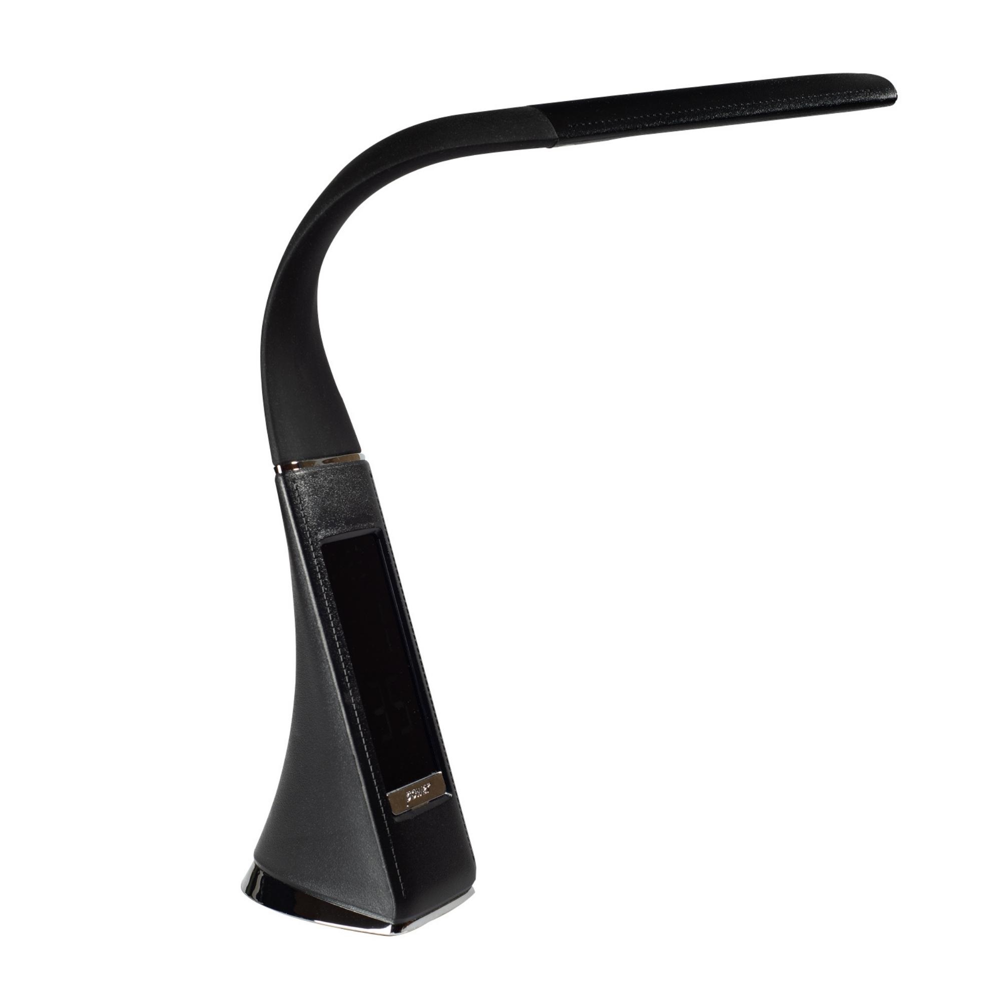 Светильник светодиодный настольный с часами, календарем и термометром TLD-542 Black/LED/300Lm/5000K/Dimmer предназначен для освещения рабочего места. На корпусе светильника расположен дисплей, отображающий текущие дату, день недели, время и температуру. Сенсорная кнопка находится на корпусе в нижней части дисплея. На основании корпуса расположены кнопки управления. С помощью диммера можно регулировать уровень яркости светильника. Не требует сборки. Гибкий корпус позволяет регулировать угол наклона светильника. Мощность - 5 Вт, что соответствует мощности лампы накаливания 30 Вт. Световой поток - 300 лм, цветовая температура - 5000 К. Корпус светильника стилизован под кожу, изготовлен из пластика, цвет - черный. Современный, стильный и функциональный настольный светодиодный светильник украсит любое рабочее место. Требуется подключение к электросети. В комплект поставки входят блок питания и провод. Габариты светильника - ДхШхВ 150х55х300 мм. Общий вес комплекта - 667 г. Гарантия - 2 года. Срок службы светильника - 50 000 часов.