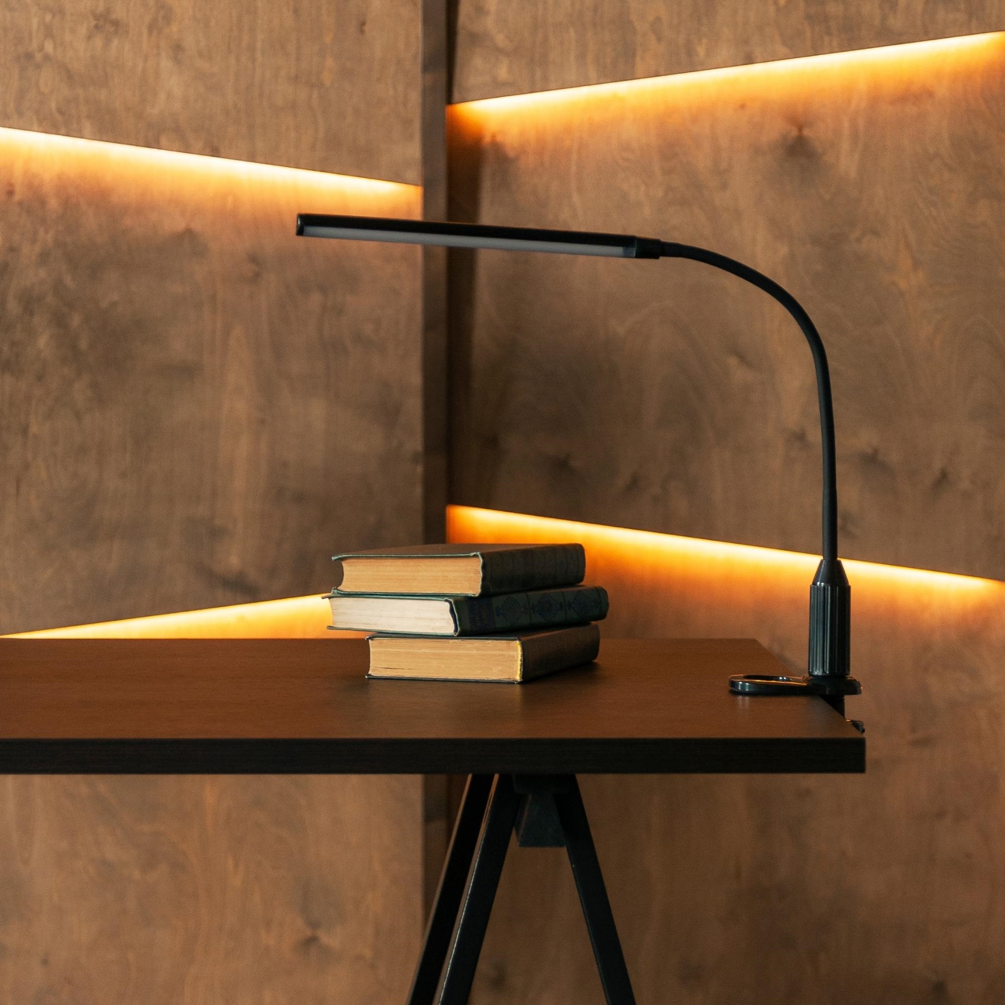 Светильник настольный светодиодный на струбцине TLD-572 Black/LED/500Lm/4500K/Dimmer предназначен для освещения рабочего места. Не требует сборки. Гибкая ножка позволяет регулировать угол наклона и высоту светильника. Сенсорный выключатель с диммером расположен на плафоне светильника. С помощью диммера можно регулировать уровень яркости светильника. Мощность - 7 Вт, что соответствует мощности лампы накаливания 45 Вт. Световой поток - 500 лм, цветовая температура - 4500 К. Корпус светильника изготовлен из пластика, окрашенного в черный цвет. Требуется подключение к электросети. Лаконичный и стильный дизайн светильника впишется в любой интерьер. Удобное крепление - струбцина позволяет надежно зафиксировать светильник на столе. Требуется подключение к электросети. В комплект поставки входят блок питания и провод. Габариты светильника - ДхШхВ 100х80х300 мм. Общий вес комплекта - 500 г. Гарантия - 2 года. Срок службы светильника - 50 000 часов.