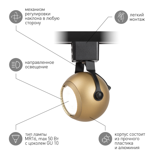 Однофазный трековый светильник под лампу с цоколем GU10. Светильник выполнен из металла, корпус имеет форму шара, установленного на карданный держатель. Плавные формы и многообразие цветов исполнения делают светильник TR35 идеальным кандидатом на роль акцентного света в вашем проекте.
