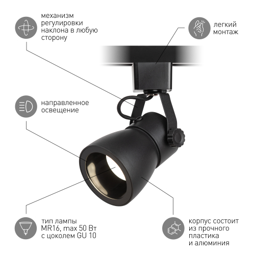 Однофазный трековый светильник под лампу с цоколем GU10. Корпус светильника выполнен из алюминия, декоративные элементы - из пластика. Особенность данной модели состоит в наличии глубоко утопленной лампы, что снижает эффект ослепления и делает пребывание под таким источником света максимально комфортным. Макс. мощность лампы 15W.